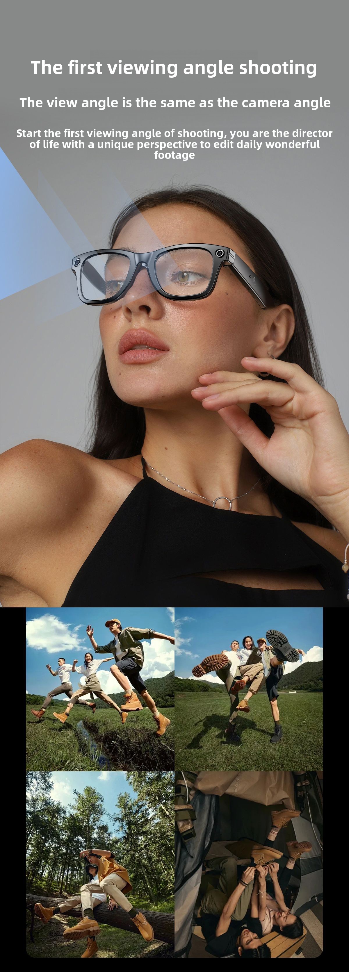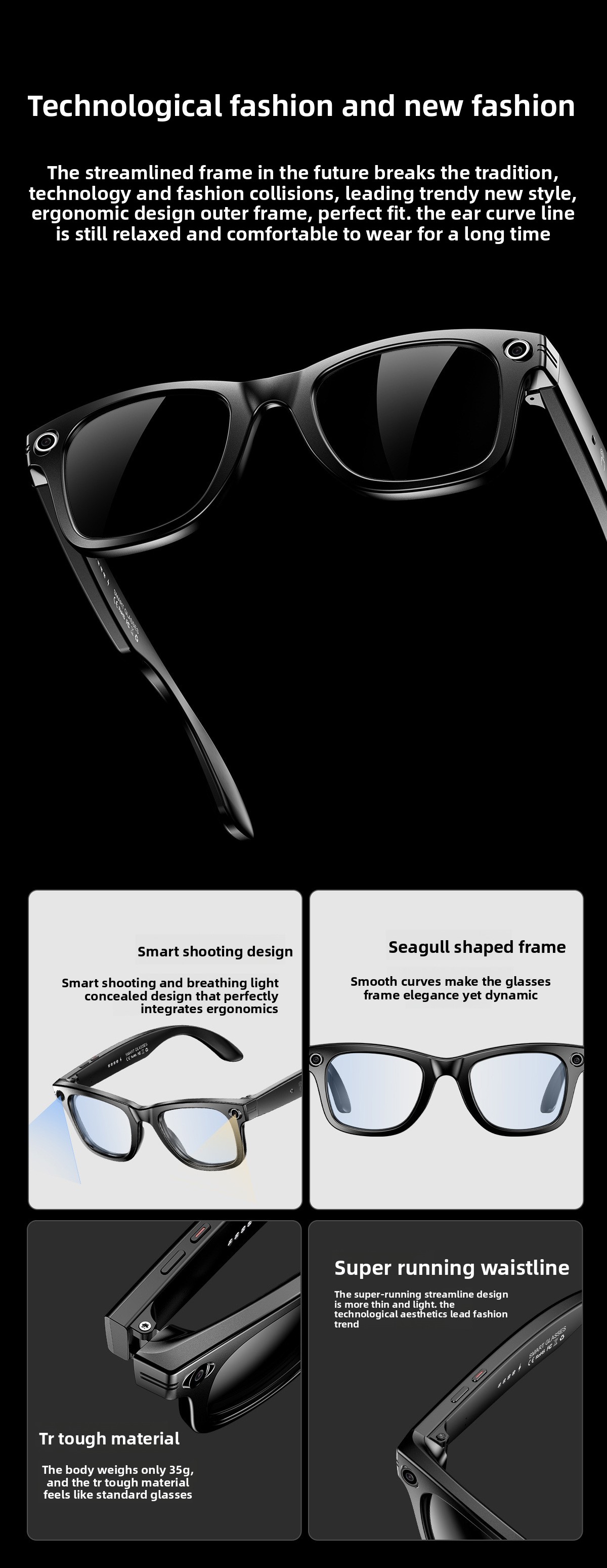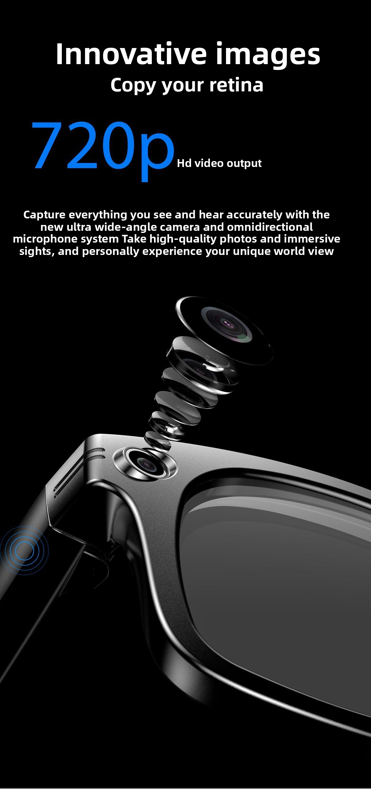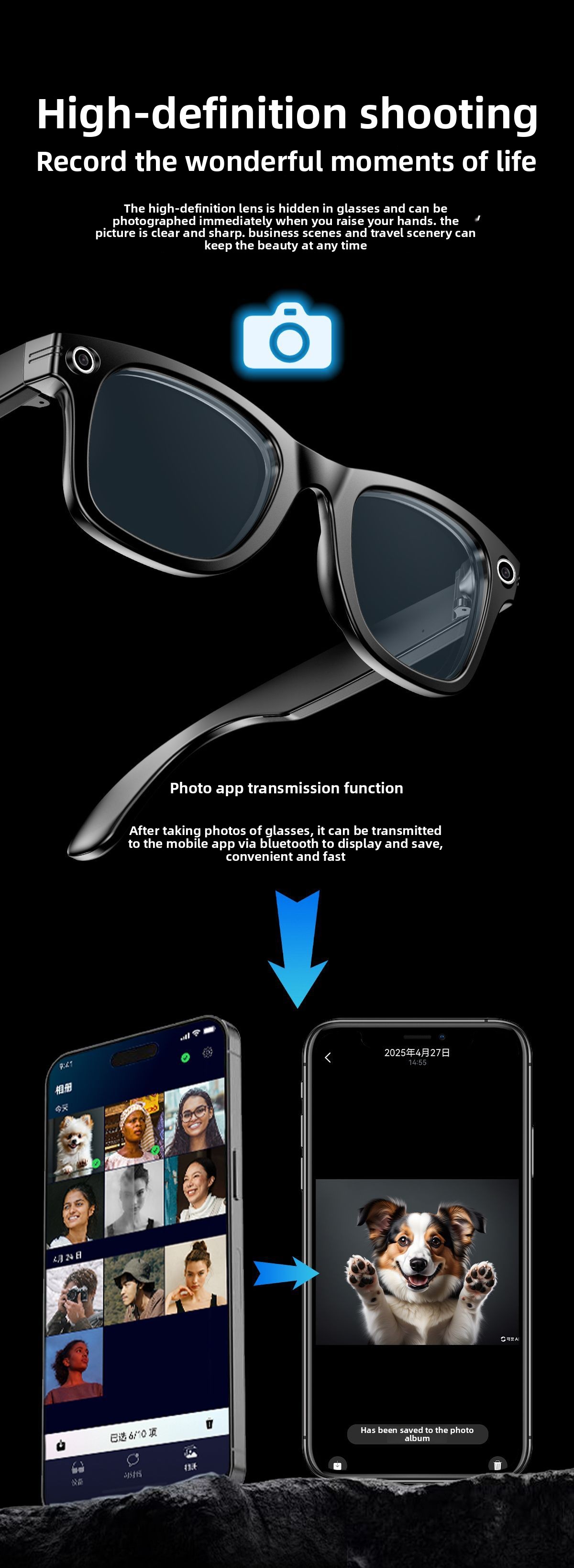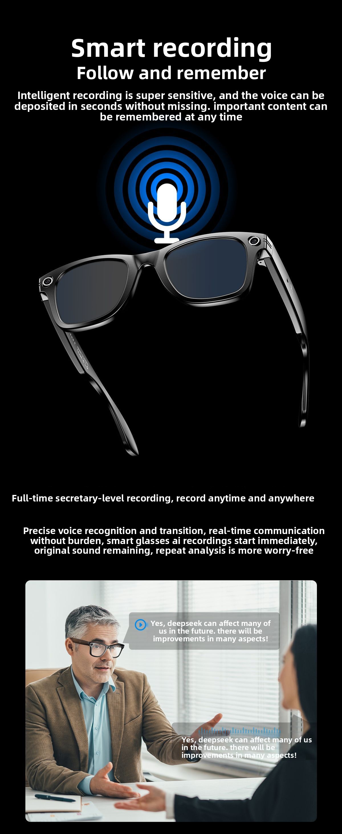 AI Smart Glasses: Features AI photo recognition, image translation, photography, video recording, and voice recording.
