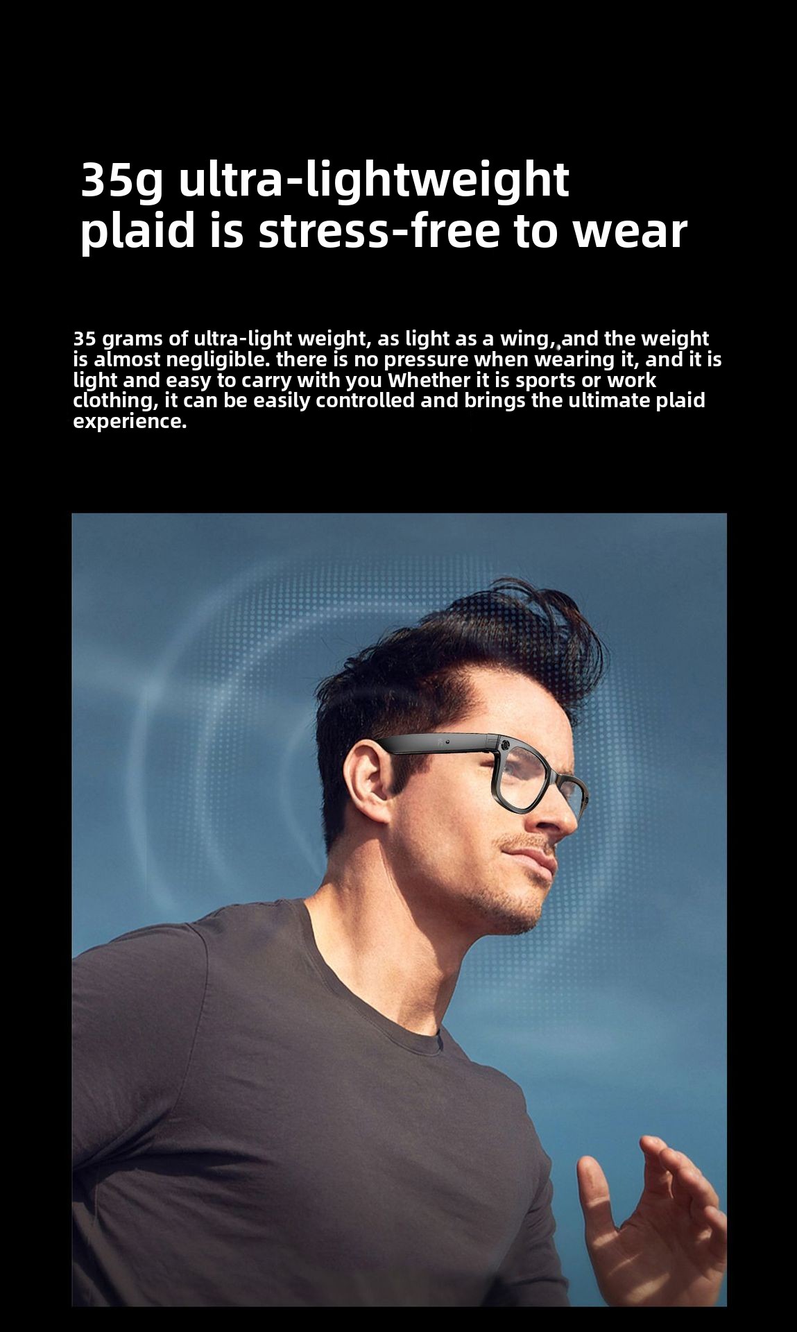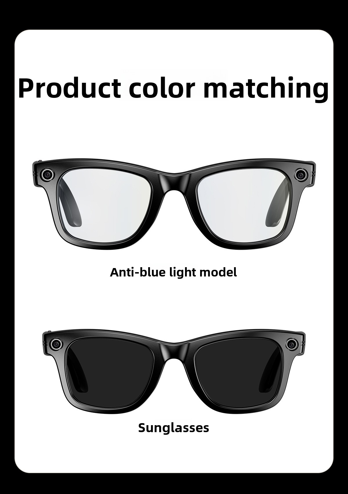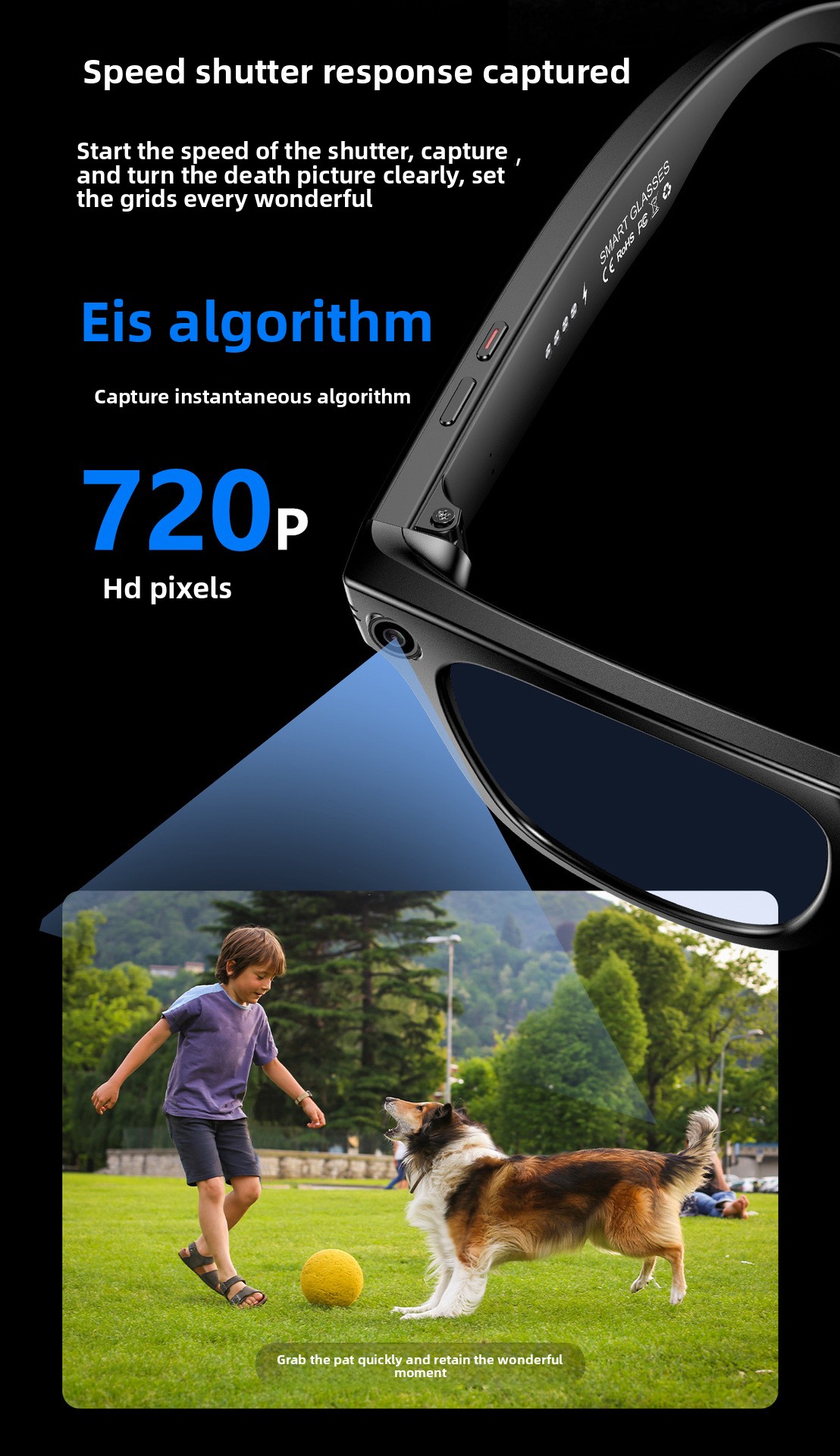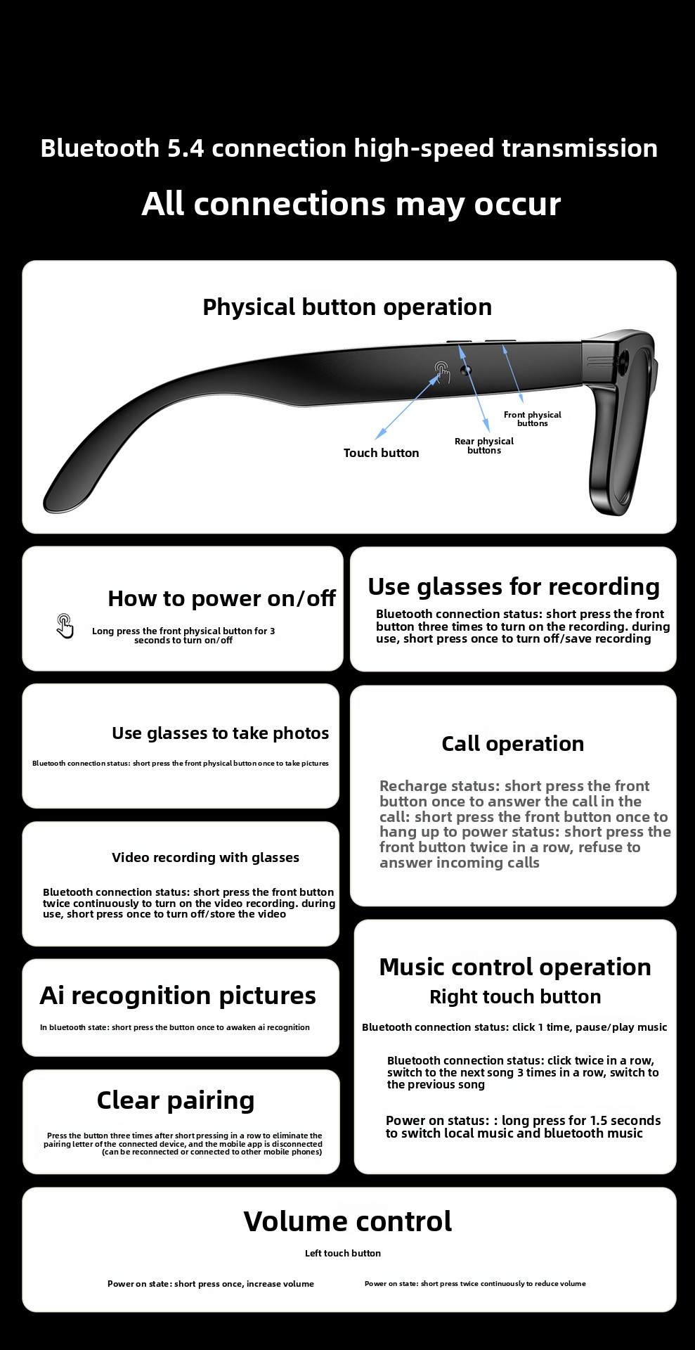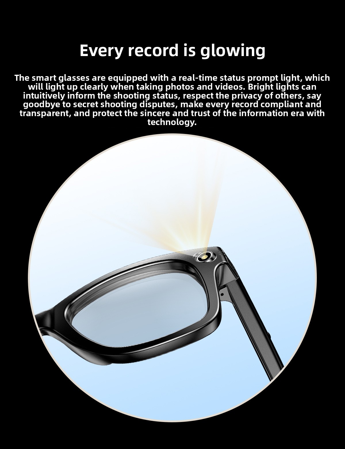 AI Smart Glasses: Features AI photo recognition, image translation, photography, video recording, and voice recording.