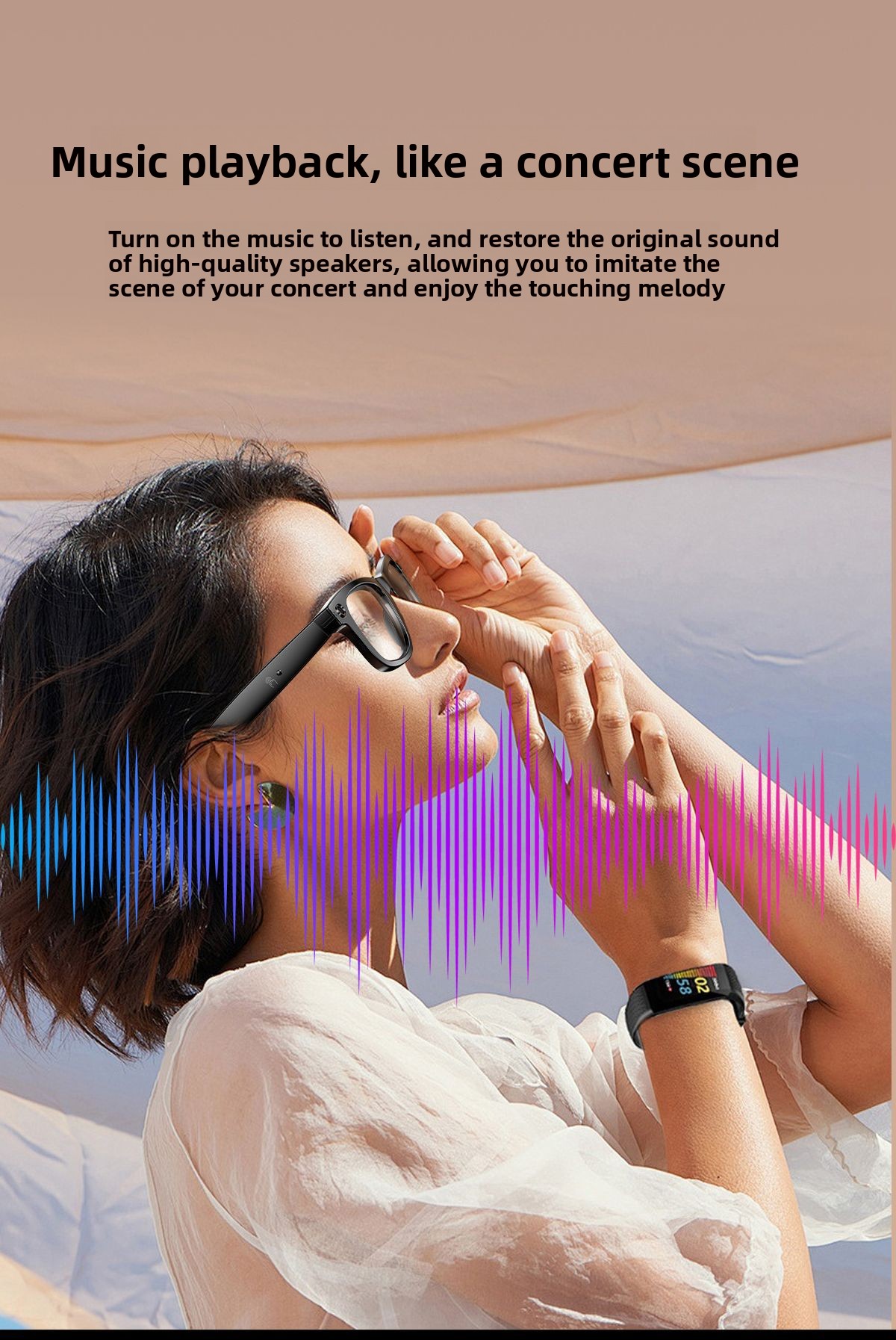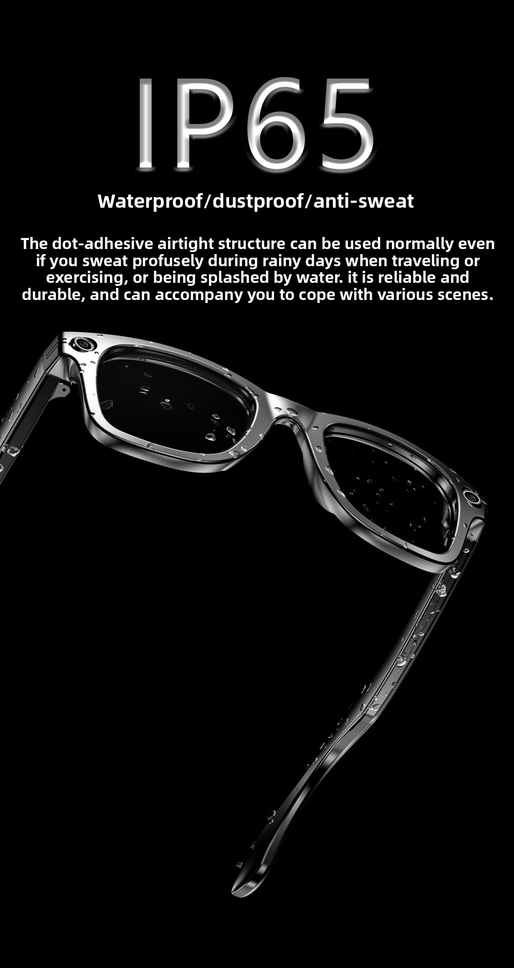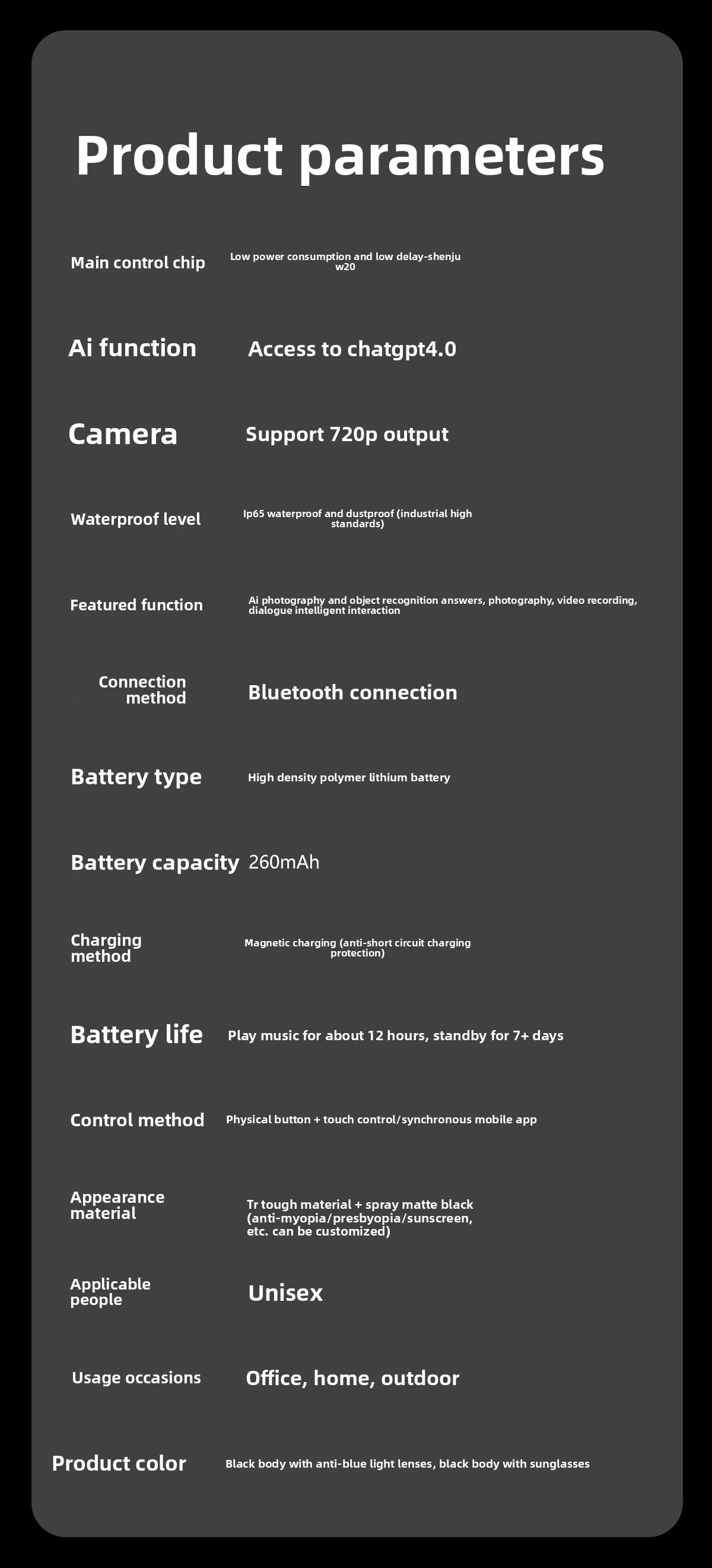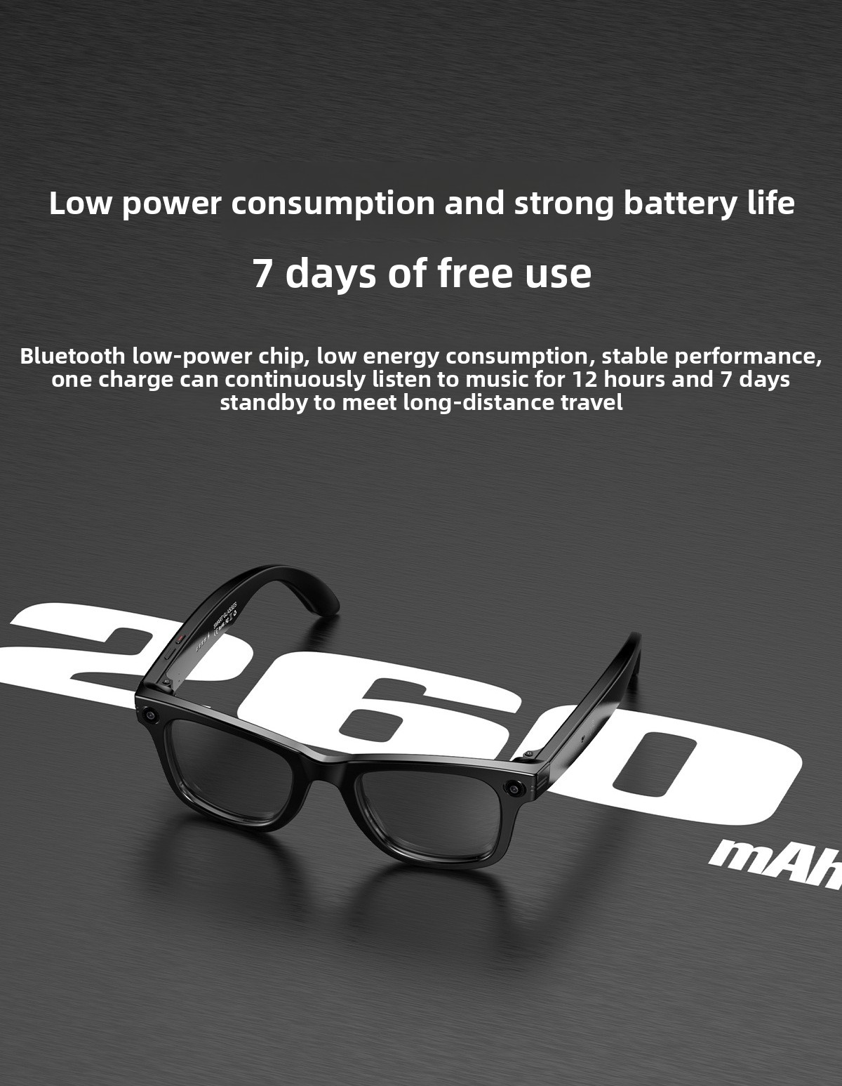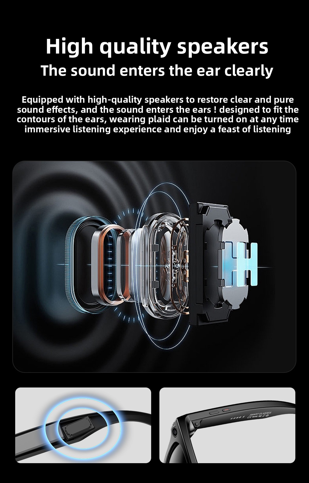 AI Smart Glasses: Features AI photo recognition, image translation, photography, video recording, and voice recording.
